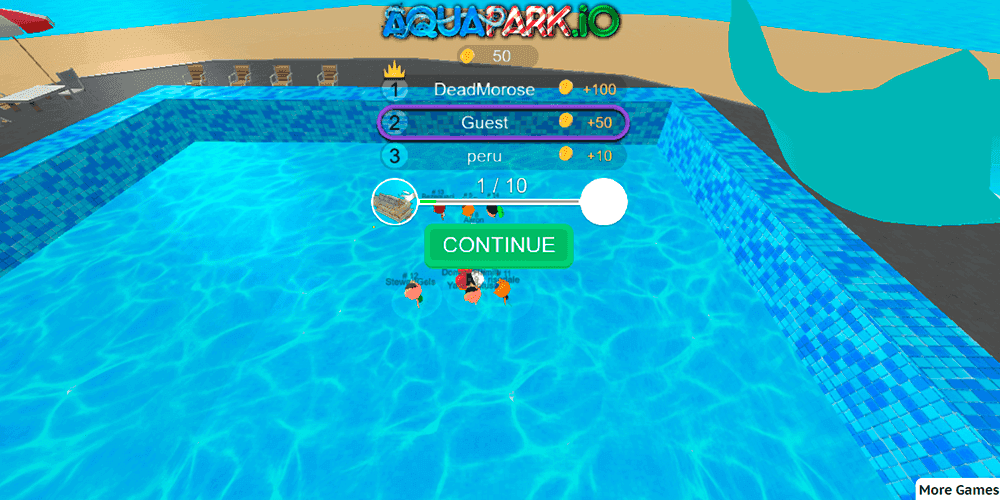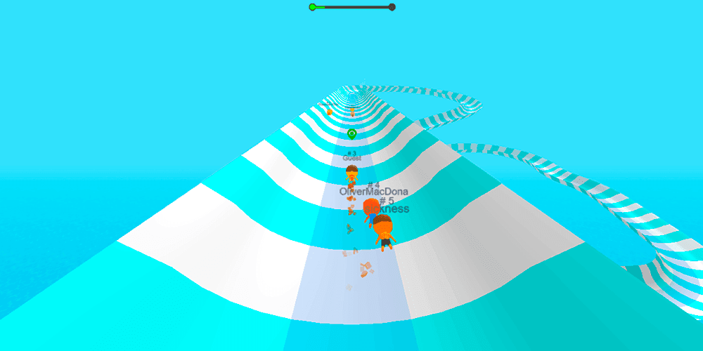 The controls are simple. You steer your character left and right with a finger on the screen, and positioning matters more than it first appears. Sliding through the center of the track builds speed, while drifting to the edges slows you down. Staying directly behind another player gives you a drafting boost, letting you slingshot past them on the next turn. But the real skill in Aquapark.io is shortcut hunting. The game rewards controlled recklessness over clean racing. At virtually every bend, you can jump off the slide and land on a lower section, shaving seconds off your run. The key is restraint. Aiming for the very bottom of the map from the top rarely works because you only carry momentum for a short glide. Overshooting a jump means falling off the course entirely. The smarter play is to cheat little and often, skipping one turn at a time rather than gambling on a full-course leap. Treat every completed turn as wasted time, jump out, rejoin below, and repeat. Collisions with opponents serve a dual purpose as well. Bumping a rival off the edge earns coins and clears your path, though chasing kills too aggressively can cost you the lead. When the steering, the shortcutting, and the bumping all click together, the game delivers a satisfying burst of arcade momentum that justifies its popularity.