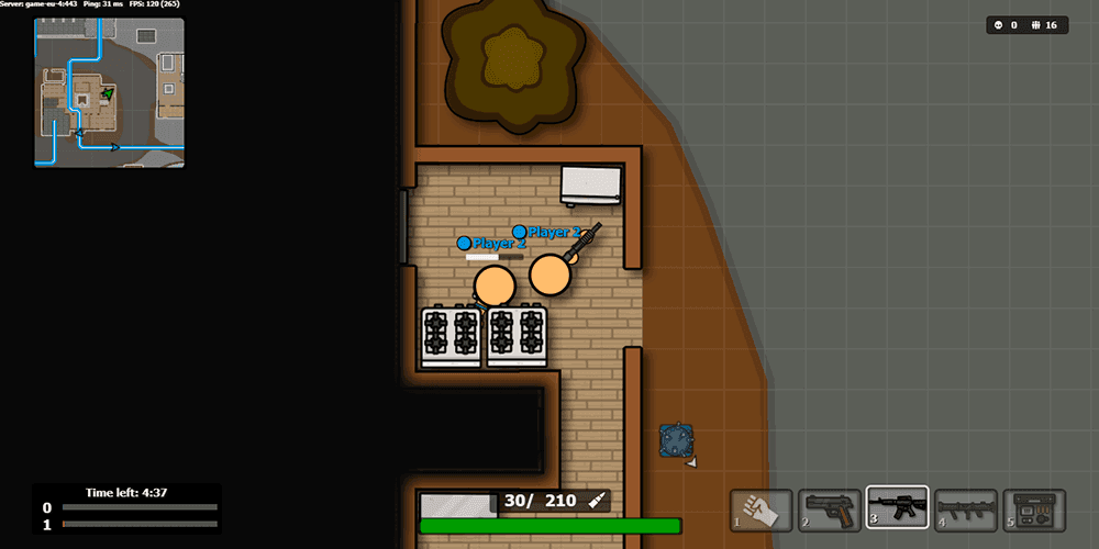 BattleDudes.io is a free 2D multiplayer browser shooter developed by Šarūnas Visockas and released in late 2020. The premise is straightforward: drop into a top-down arena, grab your weapons, and fight other players across a variety of maps and modes. What makes it click almost instantly is how little stands between you and the action. There is no download, no installation, and no lengthy tutorial. You open a browser tab, pick a server, and within seconds you are trading fire with real opponents. For the .io genre, that kind of frictionless entry is expected, but BattleDudes.io pairs it with a feature that most of its lightweight competitors never attempt: fully destructible environments.