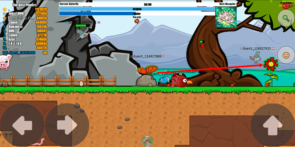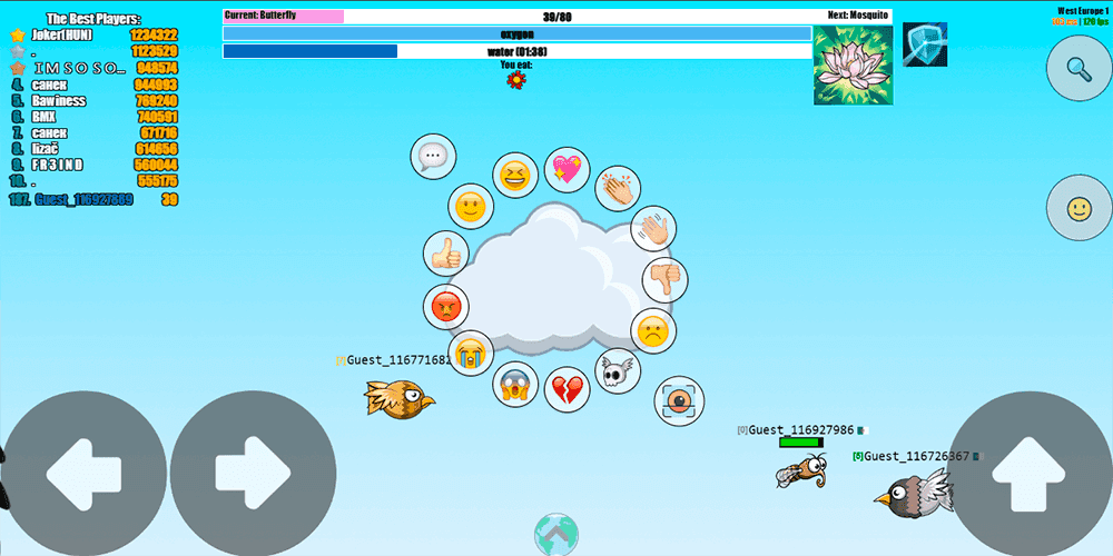 The moment-to-moment gameplay revolves around a tight loop of feeding, fleeing, and staying hydrated. Creatures outlined with a green border are safe to eat and grant experience points, while anything marked with a red border is a predator that can end a run in seconds. This color-coded system keeps things readable even in chaotic situations, but reading the screen is only half the battle. Players also need to monitor a water supply bar displayed on screen. If hydration drops to zero, the creature dies, and searching for water is never entirely safe because predators tend to lurk near the same resources. Health only regenerates through feeding, which means passive play has a hard ceiling. Staying alive demands aggression, because a player who refuses to hunt will eventually run out of health with no way to recover. Movement shifts between flying and swimming depending on the current creature form, and the map offers hiding spots like clouds and bushes where smaller creatures can take cover from threats overhead. Because EvoWorld.io is a massively multiplayer online game, servers are populated with dozens of real players at any given time. There is no pause button, no safe zone that lasts forever, and no way to predict what another player will do. That persistent human element turns even basic mechanics into something strategically engaging.