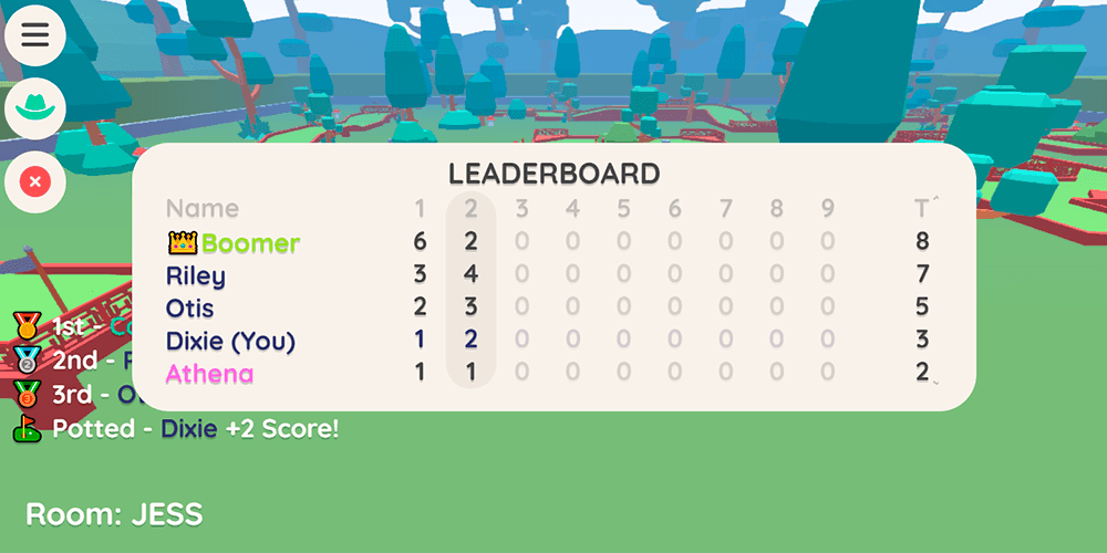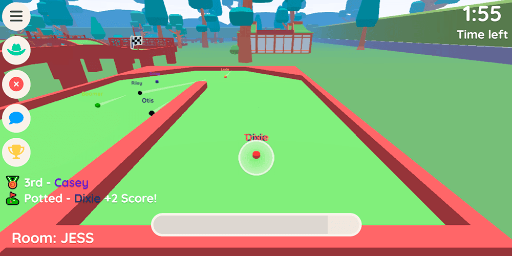 Where Golfparty.io really comes alive is in the competitive multiplayer. Live Race mode has everyone tee off simultaneously, and the leaderboard updates in real time as players approach the cup, so you always know exactly where you stand. Stroke Challenge rewards efficient shot counts, but tiebreakers come down to total time, which means you cannot afford to deliberate for too long even when accuracy matters most. Private friend lobbies round out the options, letting you share a room code and battle for bragging rights without random opponents muddying the rivalry. The scoring system, combining strokes with completion speed, keeps matches feeling brisk and pressurized. A round rarely lasts more than a couple of minutes, yet there is enough depth in the course design to keep you replaying the same holes as you hunt for cleaner lines and faster finishes. Cross-platform convenience is another strong point; mouse precision helps with tight bank shots on desktop, while touch controls feel natural for quick swipes and micro-adjustments on mobile, so neither platform feels like a compromise. That said, the competitive format can sting. Mistakes add up fast, and some holes are genuinely unforgiving if you overhit a ramp or misjudge a blind corner. One bad stroke can knock you from first to last with no way to recover, which may frustrate players who prefer a more forgiving pace. But that punishing edge is also what makes a clean run feel so rewarding. The short match length means a rough round is over quickly, and you can immediately queue up another attempt to chase the line you know is there. For a free, no-install browser game, Golfparty.io delivers a surprisingly sticky competitive loop that keeps pulling you back one more round at a time.
