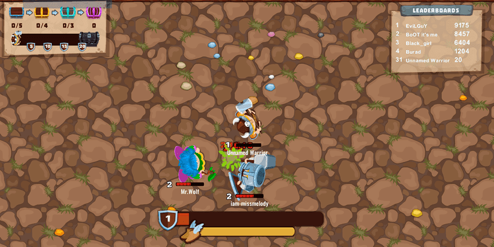 Matches in MiniGiants.io follow a rhythm that feels natural within seconds. Your character trails the cursor, left click swings your weapon, and right click triggers a limited speed boost that recharges over time. That is the entire control scheme, and it is plenty. Early rounds are all about farming: you weave through the arena scooping up colorful experience stones, steering well clear of anyone who has already stacked a few levels. The tension at this stage comes from reading the battlefield. A larger player charging in your direction demands an immediate boost to safety, while a wounded opponent limping away from a fight they barely survived presents a tempting opportunity for a quick snipe.