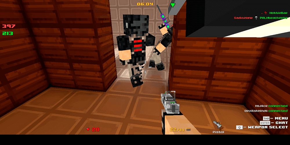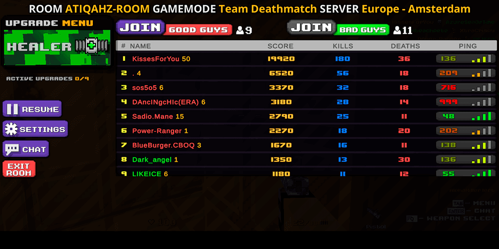 The moment you hit the menu screen, you will see a list of active game rooms already populated with players. Jump into any one of them and you are fighting instantly, no lobby countdown, no waiting for a server to fill. Match types range from classic free-for-all deathmatches to team-based modes and a zombie infection variant that turns eliminated players into undead threats hunting the survivors. Each room runs on its own map with its own settings, so scrolling through the list already offers variety before you fire a single shot.