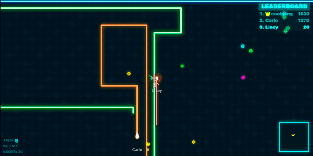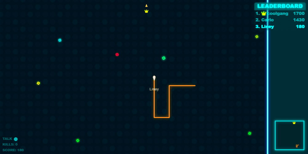 Sharp 90-degree turns are both a limitation and a weapon. Because movement is locked to horizontal and vertical axes, every directional change is crisp and predictable, which means skilled players can set traps with precise geometry. Blocking an opponent's lane, boxing them against a wall, or herding them into your lengthening tail all become viable tactics once you develop the reflexes for it. And when a large snake falls, the resulting cloud of energy is enormous, attracting every nearby player into a chaotic feeding frenzy that can reshape the entire leaderboard in seconds. Surviving long enough to challenge the crowned leader — the current highest-scoring player — is the ultimate test of positioning, patience, and nerve.