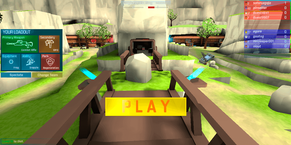 Playing Repuls.io feels fast in a way that earns the word. Movement runs on standard WASD controls with jumping, sprinting, crouching, and a grapple mechanic that lets skilled players chain together creative routes and reach high ground faster than opponents expect. The physics are snappy, jumps feel tight, and the overall tempo pushes you to stay mobile rather than camp a single angle. Weapon recoil is manageable enough to reward consistent crosshair placement, but duels still demand sharp reflexes and smart positioning. Every firefight becomes a quick decision tree: do you push from cover, swing wide with a grenade to clear the corner, or rotate through an alternate lane to catch someone off guard?
