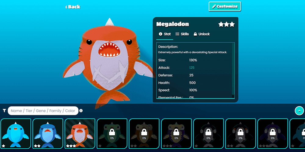 Where Stabfish 2 separates itself from the average .io title is in what happens between and across matches. Each time you fall in the arena you evolve along a defined path, progressing from a modest Blue Shark to a Great White and eventually to the imposing Megalodon. Every form unlocks new upgrade potential and abilities, so defeat never feels purely punishing — it is literally the mechanism that makes your predator deadlier. Milestone achievements gate certain upgrades, giving each evolutionary leap a satisfying sense of earned progress.