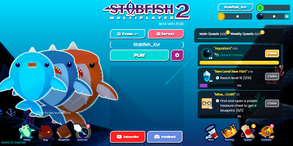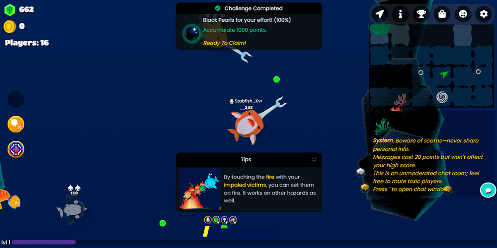The premise is almost absurdly simple: you are a shark with a pointy weapon on its face, and your job is to ram that weapon into every other player before they do the same to you. Stabfish 2 takes that idea — born in the first Stabfish as a straightforward single-player affair — and turns it into a fully competitive online arena. Real-time multiplayer, larger maps, a genuine progression system, and recurring team events transform what could have been a novelty .io game into something with real staying power. The trick is how readable and immediate the action feels the moment you drop into the water, and how much extra depth reveals itself once you start evolving, crafting gear, and jockeying for leaderboard position.