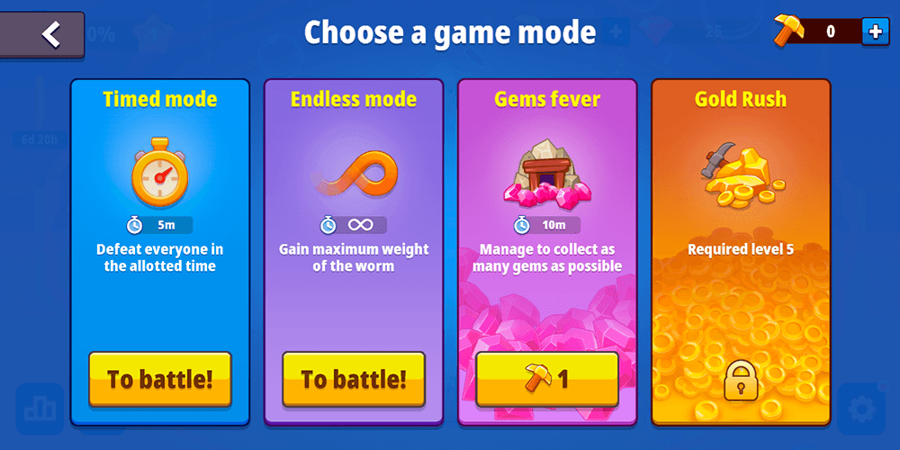 What keeps the arena feeling fresh across dozens of sessions is the rotation of distinct game modes. Timed Mode compresses the action into five-minute sprints where a shrinking zone forces worms into tighter and tighter quarters, rewarding aggressive play and snap decisions. Endless Mode strips away the clock entirely, letting players chase personal bests and push for maximum weight at their own pace. Gem Fever shifts the objective from pure size to gem collection, demanding speed and map awareness over raw bulk. Gold Rush, unlocked at level five, does the same with gold coins scattered across the field. Seasonal events tied to holidays like Christmas and summer add themed arenas, exclusive missions, and limited-time cosmetics, giving the calendar a reason to matter inside the game.