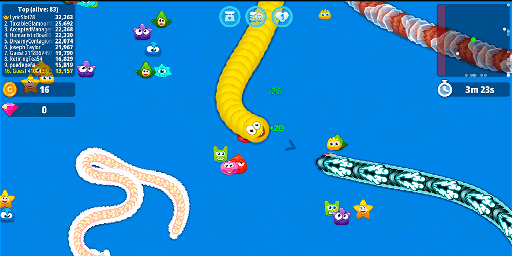 Every round revolves around a tight risk-reward loop. You guide your worm with the mouse or a finger swipe, collecting scattered food to add mass and climbing the in-match scoreboard one pellet at a time. When another worm crashes into your body it explodes into a trail of consumable energy, creating sudden feeding frenzies that can rocket a small worm to the top of the leaderboard in seconds. The reverse is equally true. One careless turn into someone else's flank and your entire run evaporates, leaving behind a buffet for every nearby rival.
